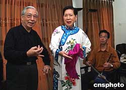 年過七旬臺(tái)灣人申陳曼麗女士(中),新近落戶上海,并在家中學(xué)京劇一絲不茍,“家教”老師是京劇大師梅蘭芳的入室弟子舒昌玉(左)。十月八日,申陳曼麗將在上海逸夫舞臺(tái)舉行自己的演出專場,上演梅派名劇、全本《玉堂春》。這位海外京劇名票粉墨登場,吸引上海眾多戲迷捧場。作者:潘索菲
