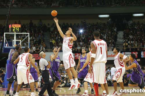 十月十四日晚,首屆NBA中國(guó)賽在上海開(kāi)賽。在數(shù)萬(wàn)名球迷的擁戴下,小巨人姚明在家鄉(xiāng)“主場(chǎng)”迎戰(zhàn)國(guó)王隊(duì)。最終火箭隊(duì)以八十八比八十六險(xiǎn)勝國(guó)王。作者:湯彥俊