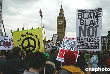 示威者高舉的大型標(biāo)語就不下數(shù)百,其中有“我們要和平,不要戰(zhàn)爭”;“撤回駐軍”;“停止以色列恐怖主義,解放巴勒斯坦”;“打倒工黨帝國主義”“打倒布什”以及“布萊爾必須下臺(tái)”等等。