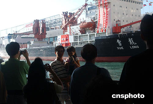 | 中國破冰船“雪龍?zhí)枴钡诌_(dá)香港補(bǔ)給并停泊在尖沙咀海運碼頭,這艘唯一能在極地航行的破冰船,冀三日的訪港活動,擴(kuò)闊港人視野!把?zhí)枴睂⒊掏蠘O挑戰(zhàn)南極的最高點,這將是中國人首次深入南極內(nèi)陸一千三百公里,創(chuàng)造中國南極考察史新紀(jì)錄。圖為10月30日大批香港市民前來圍觀“雪龍?zhí)枴逼票。作?尚金生