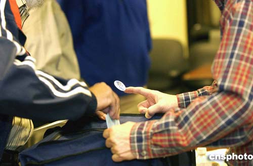 二○○四年大選中已經(jīng)全面引用先進(jìn)的電腦屏觸式投票機進(jìn)行選舉。但仍有選民偏愛紙票。圖為美西時間十一月二日上午,選民把選票投進(jìn)型似藍(lán)布旅行包的大選票箱的情景。作者:陳鋼