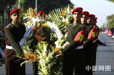 11月12日,在埃及首都開(kāi)羅,埃及士兵抬著向已故巴勒斯坦民族權(quán)力機(jī)構(gòu)主席阿拉法特敬獻(xiàn)的花圈。