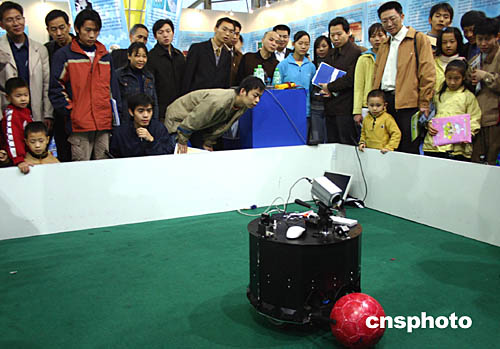 第六屆重慶高新技術(shù)交易會暨第二屆中國國際軍轉(zhuǎn)民科技博覽會十三日在重慶開幕,共展出近二千五百項科技項目。圖為“足球機(jī)器人”正在臨時圍成的球場里“踢”足球,吸引了眾多參觀者的目光。作者:郭晉嘉