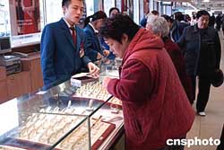 在國際金價(jià)上揚(yáng)下,京城黃金第一家----北京菜市口百貨股份有限公司從十一月十六日起,將足金飾品售價(jià)由每克126元人民幣上調(diào)至130元。當(dāng)日在北京菜百新世紀(jì)商場,一些顧客面對(duì)甫漲價(jià)的金飾品頗有“相見恨晚”之意。作者:鄒憲