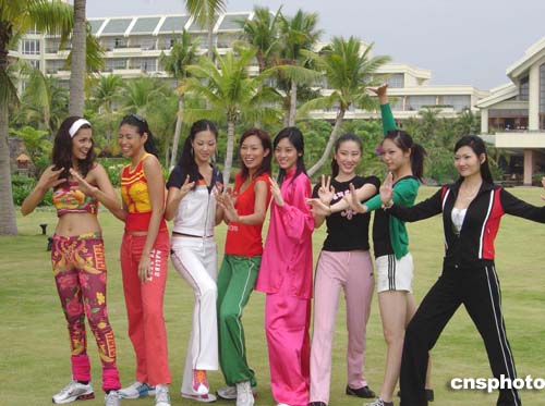 圖:世界小姐佳麗為“運(yùn)動(dòng)美人”比賽習(xí)練太極拳