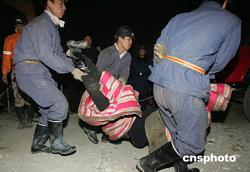 截止二零零四年十一月二十二日十九點三十分,“11.20”河北沙河礦難遇難礦工已達五十七人,另有三人下落不明。中新社記者:武仲林
