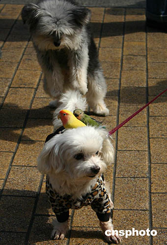 日本導(dǎo)盲犬電影《再見了,可魯》在臺灣上映首周,不僅票房突破三千萬新臺幣,而且在臺灣島內(nèi)掀起一股“可魯熱”。圖為一只小狗在主人牽引下“馱”著兩只小鳥悠然漫步臺北街頭,還惹得一只貓咪湊近觀看。中新社記者:董會峰