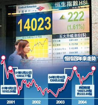 港股今早輕微高開九點(diǎn),恒指開市報一萬三千八百零九點(diǎn)。后市況反覆向上,升幅不斷擴(kuò)大,至中午收市時恒指已突破一萬四千點(diǎn)。下午,恒指一度高見一萬四千零四十八點(diǎn)。在地產(chǎn)和工商股帶領(lǐng)下,港股以接近全日最高位收市。恒指收報一萬四千零二十三點(diǎn),升二百二十二點(diǎn),升幅百分之一點(diǎn)六,成交二百六十二點(diǎn)七億港元,比二十二日多了一半。