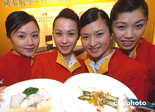 四名國(guó)泰空姐在儀式上展示空中美食。中新社記者:趙振清