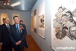 由人民日報與澳門日報合辦的“回歸情——慶祝澳門回歸祖國五周年書畫展”,二十六日下午在澳門旅游活動中心隆重揭幕,行政長官何厚鏵出席并參觀了書畫展。作者:梁永強
