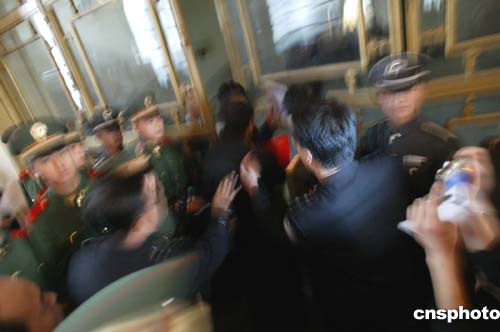 盡管全場注目的焦點都集中在勝利的512號競買者身上,但這位身著西裝的40多歲神秘男子在兩排武警的保護下沖出眾多記者的包圍圈,迅速從展廳后門離去,攝影記者都沒來得及搶下鏡頭。