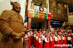 一名威武的“秦代兵馬俑”微笑著聆聽(tīng)西安市兒童圣誕唱詩(shī)班的優(yōu)美歌聲。12月4日的周末夜晚,西安市喜來(lái)登大酒店舉行迎接圣誕節(jié)亮燈儀式。與此同時(shí),這座古老城市的圣誕氣氛越來(lái)越濃。中新社記者:任晨鳴