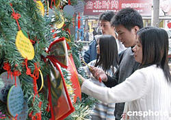 圣誕節(jié)臨近,福州市區(qū)節(jié)日氣氛漸濃。十二月六日,兩對(duì)有情人正往市區(qū)一大型商場(chǎng)前樹立的圣誕樹上懸掛許愿祈?,盼新年行好運(yùn)。作者:劉可耕