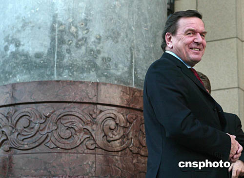 德國總理施羅德十二月七日與中國國家主席胡錦濤在北京舉行會(huì)見,活動(dòng)結(jié)束后施羅德在人民大會(huì)堂外留念。中新社記者:滿會(huì)喬