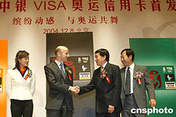 十二月八日,中國銀行聯(lián)手Visa國際組織,在北京發(fā)行全球首張以二零零八年奧運會為主題的“中銀VISA奧運信用卡”。中新社記者:廖文靜