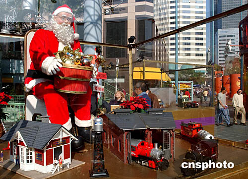 十二月十三日的美國洛杉磯街頭圣誕節(jié)氣氛漸濃,圣誕老人和懷舊微型火車裝飾再現(xiàn)過去的好時(shí)光。中新社記者:賈國榮