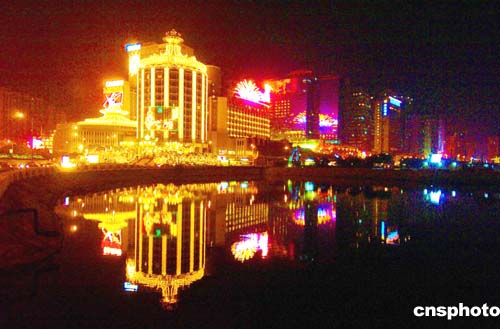 澳門回歸祖國(guó)五周年前夕,澳門一些大型建筑物晚上燈火通明,五彩繽紛,為這座不夜城增添了節(jié)日喜慶氣氛。作者:宋吉河