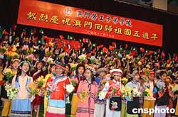 今天下午,澳門勞工子弟學(xué)校舉辦慶;貧w五周年活動(dòng)。奏國歌、民族舞蹈、武術(shù)與古箏表演、大合唱,活動(dòng)豐富多彩。潘建英、潘曼霞、牟琴三位嘉賓的出現(xiàn),贏得現(xiàn)場近千名師生的熱烈掌聲,更把活動(dòng)推向高潮。