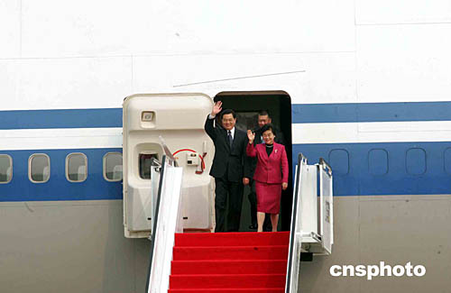 胡錦濤在何厚鏵的陪同下,向歡迎的當(dāng)?shù)孛癖姄]手致意。