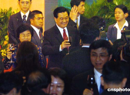 中共中央總書記、國家主席、中央軍委主席胡錦濤,19日晚出席澳門特別行政區(qū)歡迎晚宴時,向澳門參加晚宴的各界人士敬酒。作者:宋吉河