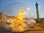 當(dāng)?shù)氐氖フQ裝置中,最矚目首推Vendome廣場上一個個巨型圣誕泡泡玻璃球,不但每個泡內(nèi)也藏有一株圣誕樹,透過光折射,似將整個廣場藏于泡內(nèi),很有童話色彩﹗原來這些玻璃球是紀(jì)念瑞士在巴黎推廣旅游一百周年而特地設(shè)置的。