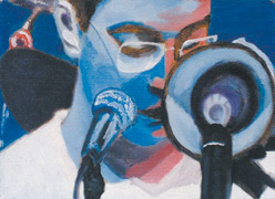 竇唯還特別喜歡用畫描繪自己樂隊演出時的景象,在昨日曝光的作品中就有兩幅。從畫面上看,一組搖滾樂隊正在舞臺上盡情揮灑激情,而臺下的觀眾也投入欣賞。另外一幅自畫像更是惹眼,藍色是畫的基調(diào),畫中的竇唯掩在兩只話筒后面,低頭正沉醉地低唱著?偟目磥,竇唯的小畫未必惹眼但很精妙。不賣不展