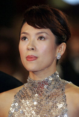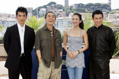 5月19日,中國(guó)電影導(dǎo)演張藝謀(左二)、女影星章子怡(右二)、男影星金城武(左)和香港老牌影星劉德華一起出席影片《十面埋伏》在法國(guó)南部影城戛納的首映式。