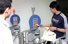 5月25日,2004年北京國(guó)際汽車(chē)展新聞發(fā)布會(huì)在北京舉行,中國(guó)國(guó)際展覽中心集團(tuán)公司(中展集團(tuán))在會(huì)上宣布,今年的車(chē)展將全面啟用電子票證系統(tǒng),以解決歷屆汽車(chē)展買(mǎi)票難、賣(mài)票現(xiàn)場(chǎng)混亂以及假票等問(wèn)題。圖為參加新聞發(fā)布會(huì)的記者提前體驗(yàn)電子票證系統(tǒng)的快捷、方便。中新社記者:盛佳鵬