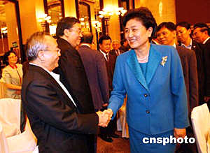 5月26日,香港著名藝人汪明荃盛裝在君悅酒店出席活動(dòng),與訪港的全國政協(xié)副主席、中共中央統(tǒng)戰(zhàn)部部長劉延?xùn)|見面。作者:洪少葵