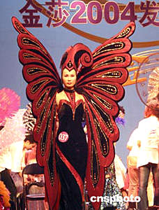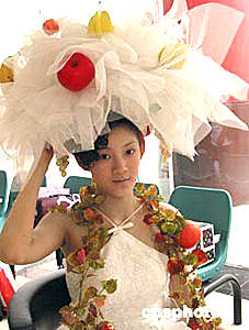 南京金莎二零零四發(fā)型化妝大賽上的水果妝金莎二零零四發(fā)型化妝大賽五月二十七日在南京紫金大戲院舉行,來(lái)自江蘇美容美發(fā)業(yè)的二百多名選手參加了剪吹、新娘化妝、形象設(shè)計(jì)等環(huán)節(jié)的比賽。作者:孫愛(ài)華