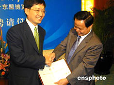 五月二十八日,廣西自治區(qū)主席陸兵(右)在南寧向香港貿(mào)發(fā)局總裁林天福頒發(fā)聘書,聘請他為中國—東盟博覽會高級顧問。作者:蔣雪林