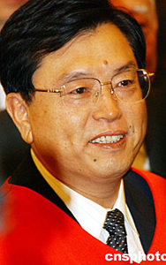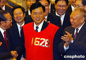 中共中央政治局委員、廣東省委書(shū)記張德江,五月三十一日來(lái)到香港聯(lián)合交易所進(jìn)行訪問(wèn),圖為出市代表贈(zèng)送張德江紅馬甲。中新社記者:錢(qián)興強(qiáng)