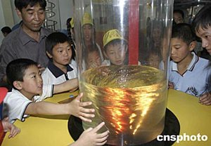 六月一日,幾名打工子弟在宋慶齡科技館觀看漩渦演示器。宋慶齡基金會(huì)專門撥款四十余萬(wàn)元為科技館增添了一批科普活動(dòng)器材,先后邀請(qǐng)一百多名打工子弟免費(fèi)來(lái)此歡度“六一”。中新社記者:史利