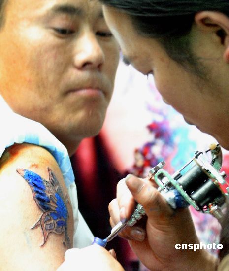 6月1日,南京湖南路一家美容店內(nèi),美容師為一名男士在胳膊上紋上一只“造價”500元的彩蝶。隨著夏天臨近,新潮的男士們也想在自己的身體上秀一把。DD 攝