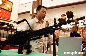 六月在北京民族文化宮舉辦的首屆中國民間工藝品博覽會上,由江蘇省南通木雕藝術家朱宇用黑檀木精雕細刻制作的仿真木雕藝術作品《寧靜》,成為最吸引觀眾的藝術品之一。這個倡導世界和平的作品以輕機槍為腳本,其做工之精細堪稱一絕。中新社記者:鄒憲