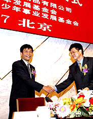 中國(guó)青少年發(fā)展基金會(huì)常務(wù)副秘書長(zhǎng)涂猛(左),二○○四年六月初在北京人民大會(huì)堂接受一家企業(yè)捐款時(shí)表示,希望工程起動(dòng)十五年來(lái),共收到社會(huì)各界捐款二十四億人民幣,該捐款實(shí)行“一對(duì)一”制度,即每一筆款項(xiàng)都對(duì)應(yīng)某學(xué)校某學(xué)生,捐款人和學(xué)生彼此擁有對(duì)方的聯(lián)系卡片。作者:王麗南