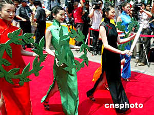 六月八日,2004年雅典奧運火炬展示活動在北京慕田峪長城舉行,身著奧運五環(huán)顏色旗袍的模特手持火炬、橄欖枝步入會場。中新社記者:鄭萍萍