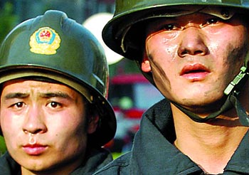 圖1臉頰灰黑的消防隊(duì)員從火場(chǎng)出來(lái)。消防員們數(shù)次深入火場(chǎng)搶救被困人員,大火撲滅后,他們?nèi)赃M(jìn)入現(xiàn)場(chǎng)搜救。