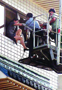 圖3消防云梯搭到4樓窗口,救出一女士。