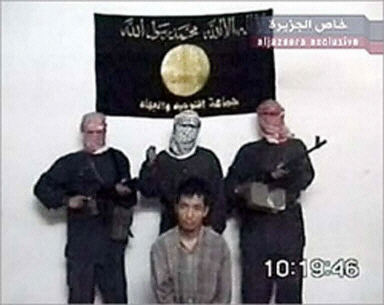 卡塔爾半島電視臺(tái)6月20日播放了一盤據(jù)稱是來(lái)自伊拉克武裝分子的錄像帶。在錄像帶中,綁匪要求韓國(guó)從伊拉克撤出軍隊(duì),否則將砍掉韓國(guó)人質(zhì)的頭。