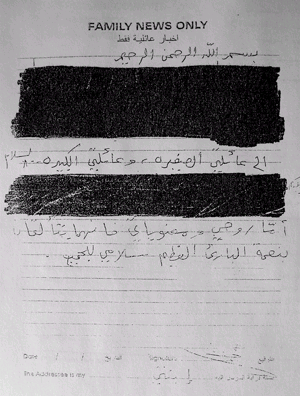 信的開頭寫道:“以慈悲的神的名義”,接下來有6行字被劃掉,再往下是“向我的小家庭和大家庭問好”,下面又有3行字被劃掉,接下來的文字是“感謝老天,我的精神很好,我的士氣很高。向所有人問好!。這封信經(jīng)過了駐伊美軍的嚴格審查,其實際內(nèi)容基本已經(jīng)不存在。魯沙旦說:“三分之二的內(nèi)容被劃掉了,只剩下17個字,根本無法理解其原意!(章田)