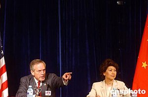 六月二十四日,美國商務部長埃文斯和勞工部長趙小蘭在北京舉行聯(lián)合記者會,就中美貿易等有關問題答記者問。中新社記者:武仲林