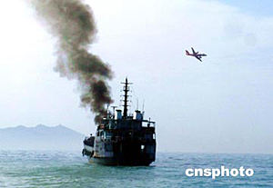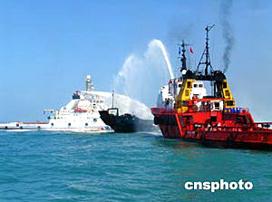 今天參加聯(lián)合搜救演習(xí)的船只共有二十九艘、另有香港飛行服務(wù)隊(duì)兩架飛機(jī)參加行動(dòng)。按照演習(xí)預(yù)定的項(xiàng)目,假設(shè)在南海某一海域發(fā)生船舶爆炸起火事故,十二名船員棄船逃生,船上有燃油溢出污染海面;另一艘船舶沉沒,十余名船員落水。海南省海上搜救中心接到報(bào)告后,立即啟動(dòng)應(yīng)急搜救程序,隨即展開了一場海陸空全方位的海上搜尋救助、海上消防滅火和海上溢油應(yīng)急行動(dòng)。結(jié)果成功營救了所有落水船員,并對遇險(xiǎn)船只進(jìn)行了消防、對海面進(jìn)行了清理污染的行動(dòng)。