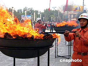 寧夏回族自治區(qū)公安廳今天在首府銀川的中山廣場舉行焚燒毒品大會,現(xiàn)場對該自治區(qū)禁毒部門二年多來收繳的四十七點二公斤毒品、五十七點五公斤大麻籽和部分精神藥品進行了集中銷毀。