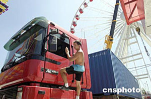 首次進入北京的世界最大“移動游樂場”——環(huán)球嘉年華原定于七月二日在國際雕塑公園向市民正式開放,但七月一日突降的大雨致使開放時間推遲。圖為工作人員在進行最后的緊張調(diào)試。作者:徐曦弋
