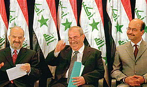 代表伊拉克新政府的權(quán)力的,主要是三個(gè)方面:總統(tǒng)、部長(zhǎng)會(huì)議和國(guó)民議會(huì)。伊拉克的總統(tǒng)很大程度是一個(gè)象征性的職位。不過,部長(zhǎng)會(huì)議發(fā)布的法令在成為法律之前,必須得到總統(tǒng)和兩個(gè)副總統(tǒng)的一致同意。