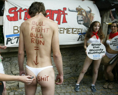 抗議隊(duì)伍沿著奔牛節(jié)中野牛奔跑的狹窄街道前進(jìn),他們高呼:“肉體折磨和摧殘并非是西班牙文化!停止血腥的奔;顒(dòng)!”