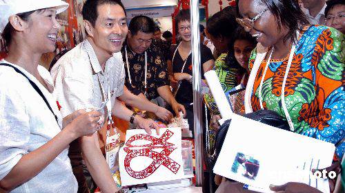 中國著名影星濮存昕(左二)、蔣雯麗七月十二日在第十五屆世界艾滋病大會中國展位上向觀眾推薦預防艾滋病中國剪紙——“紅絲帶”。中新社記者:曾利明