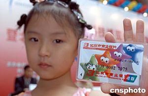 七月十四日,北京市商業(yè)銀行與共青團(tuán)北京市委、北京青少年科技文化交流服務(wù)中心共同推出成長帳戶——京卡儲蓄未來卡,以有效開展青少年理財教育工作。圖為六歲的王柯竺小朋友成為該帳戶的首位用戶。作者:徐曦弋