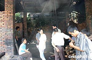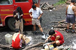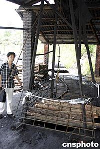 十四日七時(shí),湖南湘潭雙扶煤礦系統(tǒng)進(jìn)行提升時(shí),因電纜折斷,造成電纜短路起火,導(dǎo)致井筒木支架起火燃燒,使當(dāng)時(shí)正在井下作業(yè)的九十五人被困,F(xiàn)已確認(rèn)有六人死亡,還有三人被困井下,下落不明。圖為發(fā)生礦難的井口。作者:白祖偕